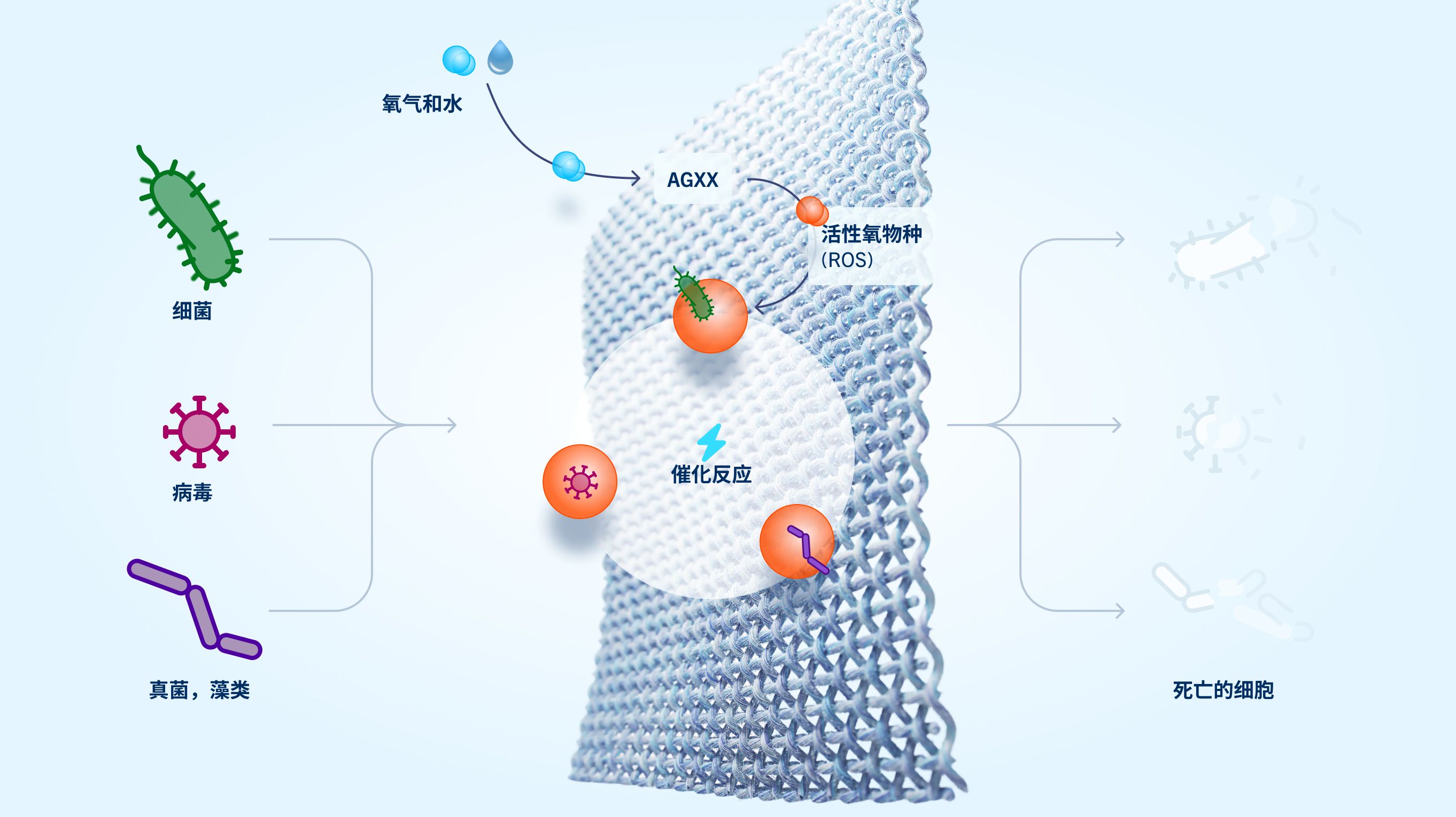 这一切得益于AGXX的创新作用机制:AGXX是一种高效催化技术,利用两种贵金属之间的相互作用,基于氧化还原反应和微电场效应。在这一过程中,空气中的氧气与水分结合,转化为活性氧自由基(ROS),这些自由基与微生物反应并将其可靠杀灭,同时防止生物膜的形成。